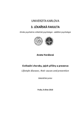 causes of civilization diseases, prevention of lifestyle diseases, physical health, mental health, social support, bio-psycho-social model of diseaseSouhrn Má bakalářská práce pojednávala o problematice civilizačních chorob. Cílem bylo pomocí dotazníkového šetření zjistit, zda a jak jsou lidé informováni o těchto chorobách, jestli znají s nimi související příčiny a jak dodržují prevenci. Zajímalo mne rovněž, zda se informovanost o tomto tématu liší podle věku a nejvýše dosaženého vzdělání. Cíle práce byly splněny a z výsledků vyplynulo, že respondenti, kteří vyplnili můj dotazník, jsou o civilizačních chorobách dostatečně informováni a prevenci převážně dodržují. Z práce rovněž vyplynul závěr o nutnosti společnost nadále a více o těchto chorobách informovat. Já osobně bych si přála, aby lidé v každém věku pravidelně a vědomě dbali na dodržování zásad zdravého životního stylu, které jsou základem prevence civilizačních chorob.